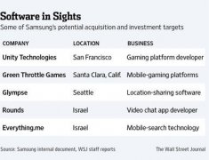 据媒体获得的内部文件显示,除了以上所述的公司以外,三星还将总部位于以色列港市特拉维夫的移动搜索引擎开发商Everything.me作为潜在的收购目标,并有意收购另一家以色列视频聊天应用创业公司Rounds,这家公司将可帮助三星与苹果Facetime和谷歌Hangouts等服务展开竞争。